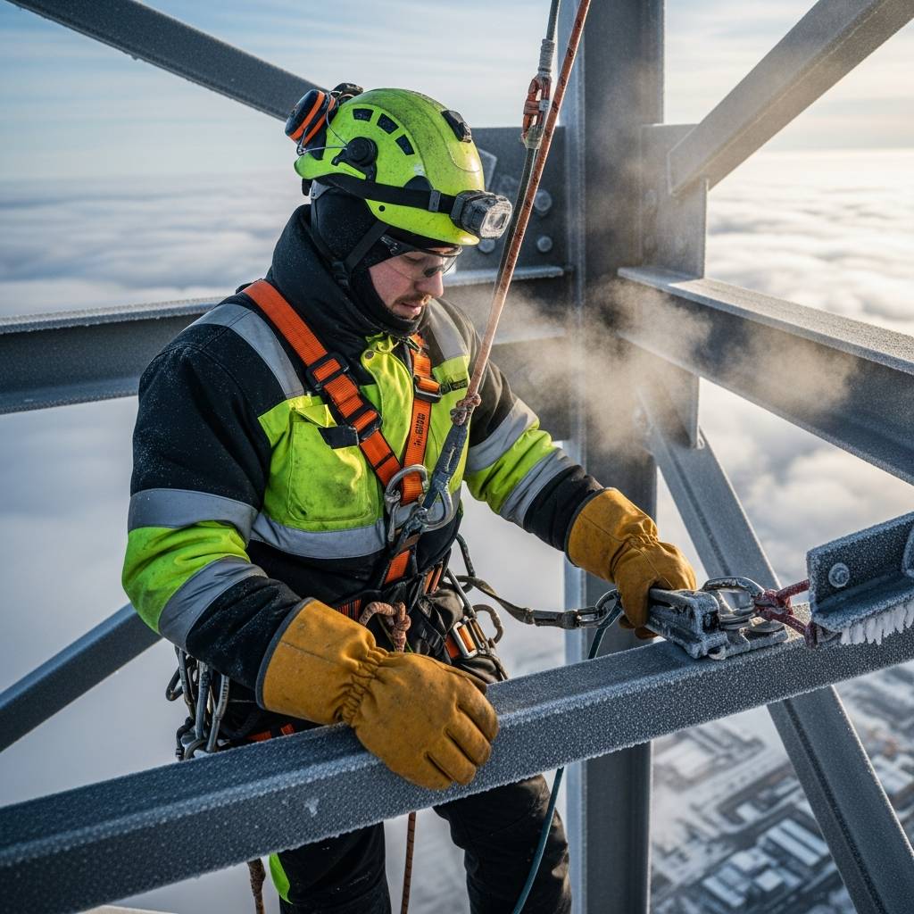冬場の高所作業において、最も警戒すべきリスクの一つが「指先の感覚消失」です。吹きさらしの足場や鉄塔の上では、体感温度が氷点下になることも珍しくありません。手がかじかんで思うように動かない状態は、単なる不快感にとどまらず、工具の落下や墜落制止用器具(フルハーネス)のフック操作ミスなど、重大な労働災害に直結する危険なシグナルです。そのため、防寒対策は快適性の追求ではなく、あくまで「安全管理の一環」として捉える必要があります。